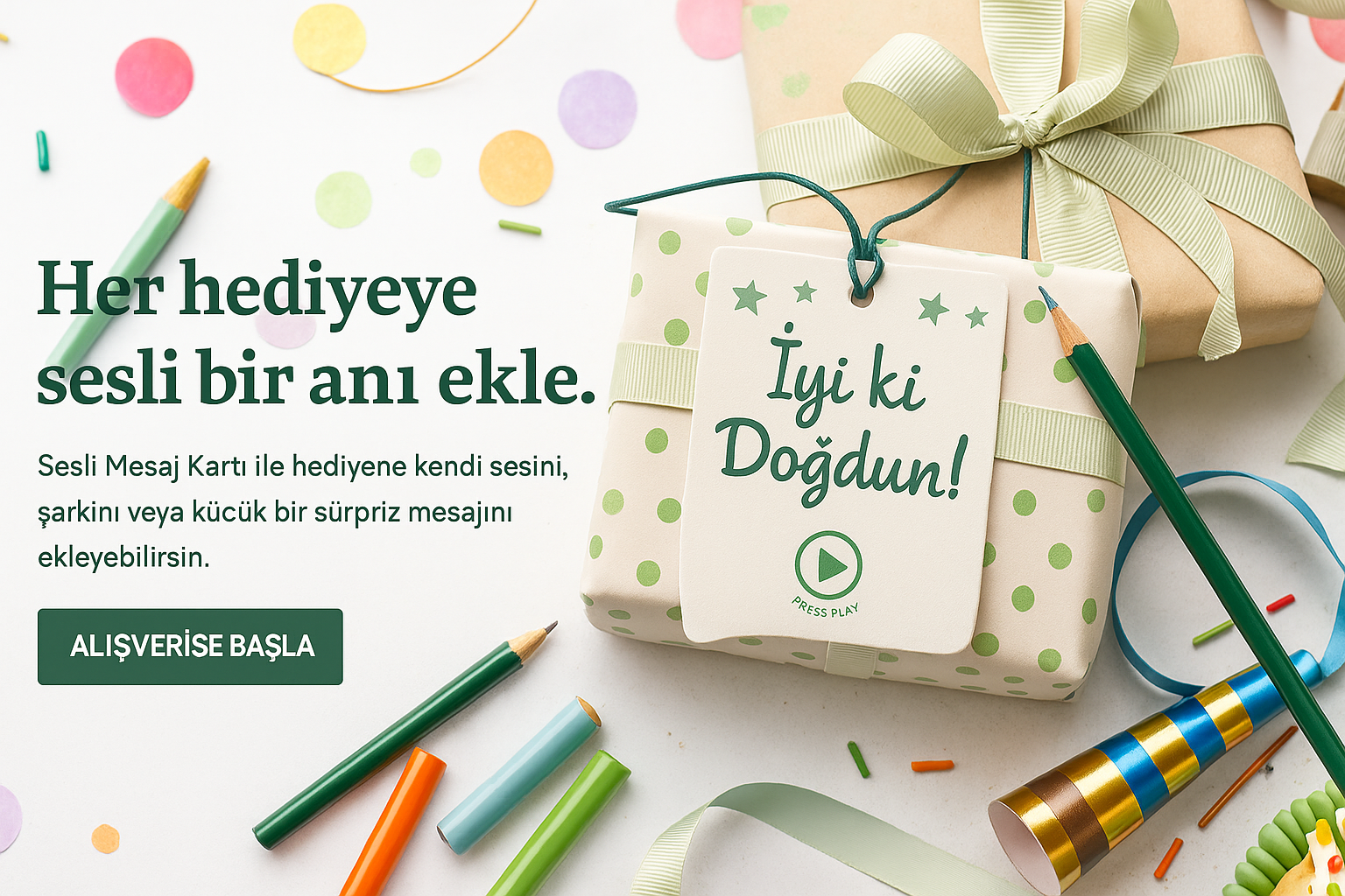 Kartı hediye paketine ekle. Karşı taraf üzerindeki ▶ Oynat düğmesine bastığında sesli sürprizin duyulur. Mesajı istediğin zaman yeniden kaydedebilirsin.